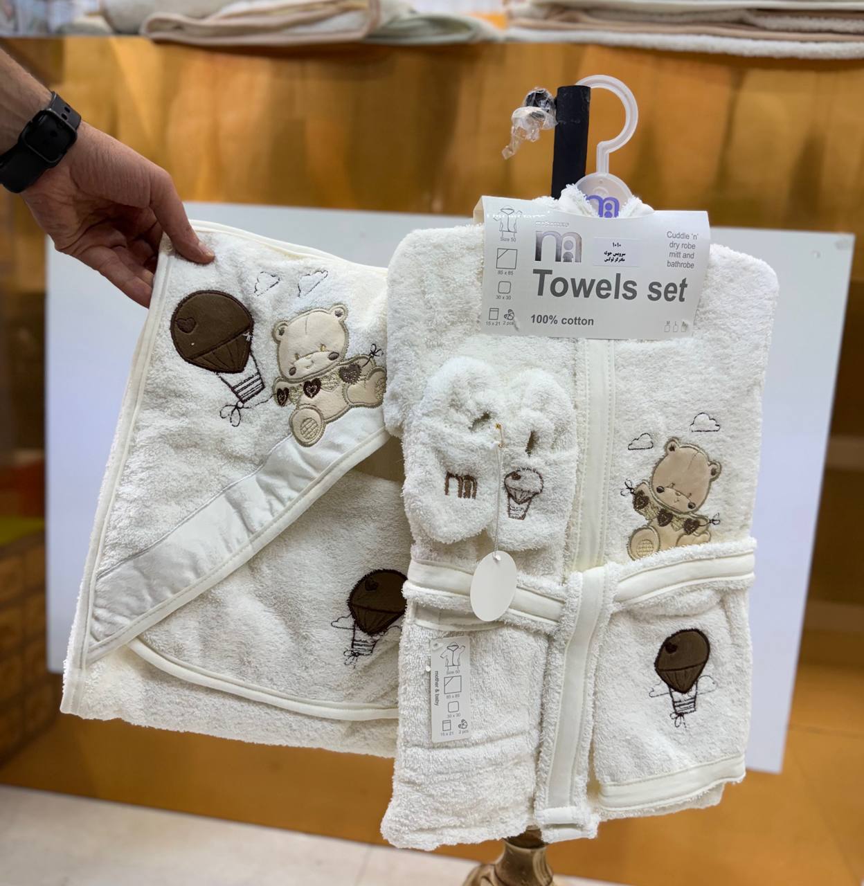 ست حوله مادر کر شامل حوله تن پوش, لیف , پاپوش,حوله کلاهدار, حوله دستی میباشد .که از الیاف نرم و لطیف تهیه شده بنابراین ضد حساسیت است .قابل استفاده از بدو تولد تا دوسال و نیم هست . و قابل شستشو در ماشین لباسشویی. این حوله بهتر است در دمای ۴۰ درجه شستشو شود تا لطافت خود را حفظ نماید. از دیگر ویژگی های این حوله کرک های کوتاه و نرم میباشد . وصد درصد نخ پنبه است.