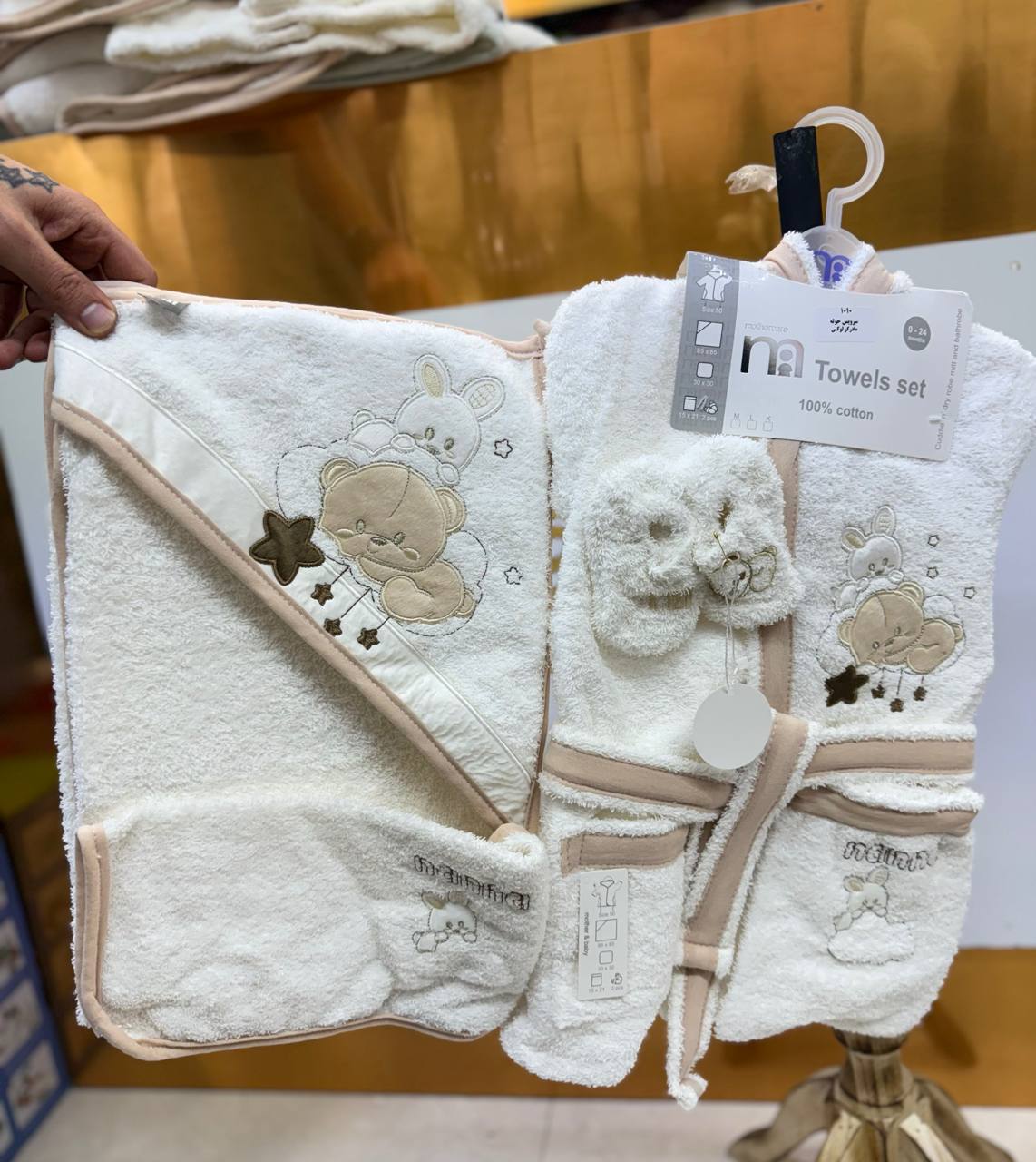ست حوله مادر کر شامل حوله تن پوش, لیف , پاپوش,حوله کلاهدار, حوله دستی میباشد .که از الیاف نرم و لطیف تهیه شده بنابراین ضد حساسیت است .قابل استفاده از بدو تولد تا دوسال و نیم هست . و قابل شستشو در ماشین لباسشویی. این حوله بهتر است در دمای ۴۰ درجه شستشو شود تا لطافت خود را حفظ نماید. از دیگر ویژگی های این حوله کرک های کوتاه و نرم میباشد . وصد درصد نخ پنبه است.