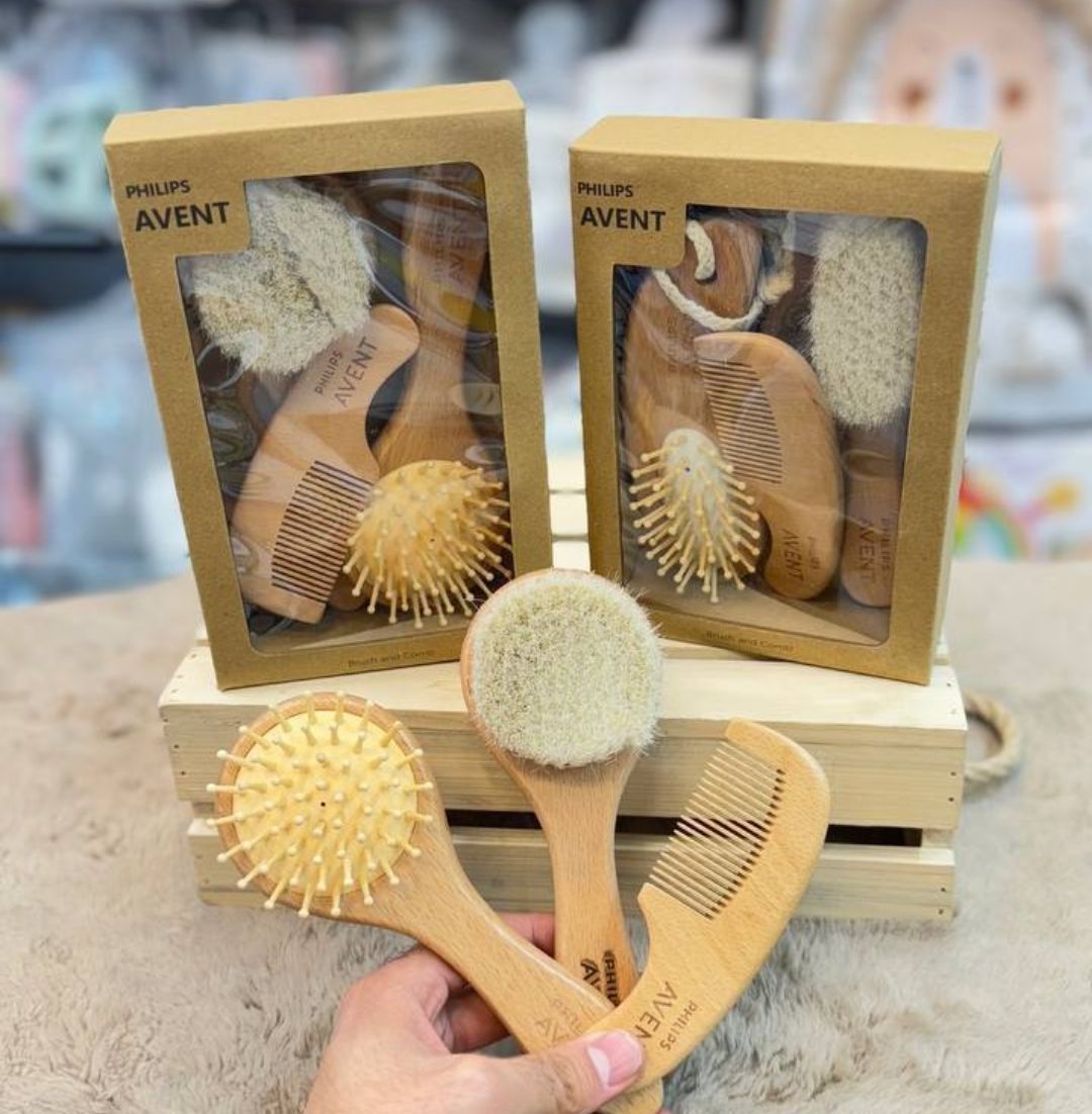 ست شانه و برس چوبی سه‌تکه AVENT یک مجموعه‌ی کامل و حرفه‌ای برای مراقبت از موهای نوزاد و کودک شماست. این محصول با طراحی ارگونومیک و متریال چوب طبیعی، نه‌تنها ظاهری زیبا و کلاسیک دارد بلکه کاملاً ضد حساسیت و ایمن برای پوست لطیف کودک شما طراحی شده است.