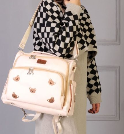 کیف کوله کرم نسکافه ای طرح تدی گلدوزی