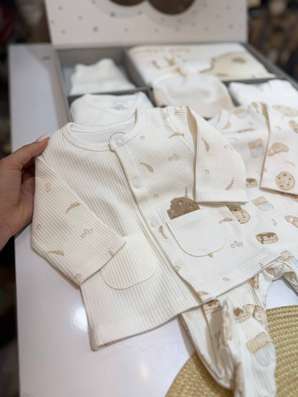 ست شامل شلوار، مانتویی جلو باز، زیر دکمه رکابی، آستین کوتاه زیر دکمه، سرهمی نوزادی، پیشبند،پتو دور پیچ، کلاه، جوراب، دستکش، آروغ گیر